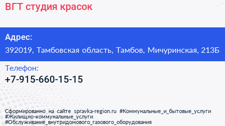 ВГТ, студия красок по адресу 392019, Тамбовская область, Тамбов, Мичуринская, 213Б в дальнейшем Организация, размещена в следующих категориях: