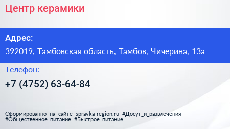 Центр керамики по адресу 392019, Тамбовская область, Тамбов, Чичерина, 13а в дальнейшем Организация, размещена в следующих категориях: