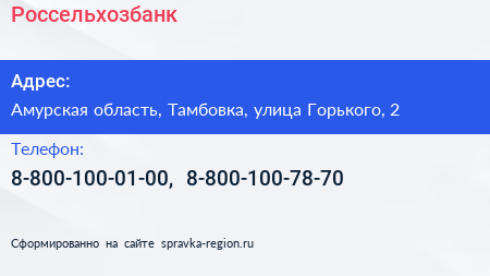 Россельхозбанк по адресу Амурская область, Тамбовка, улица Горького, 2 в дальнейшем Организация, размещена в следующих категориях: