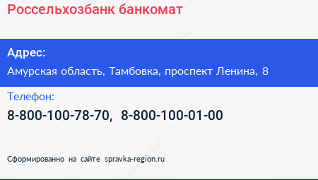 Россельхозбанк, банкомат по адресу Амурская область, Тамбовка, проспект Ленина, 8 в дальнейшем Организация, размещена в следующих категориях: