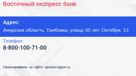 Восточный экспресс банк по адресу Амурская область, Тамбовка, улица 50 лет Октября, 13 в дальнейшем Организация, размещена в следующих категориях: