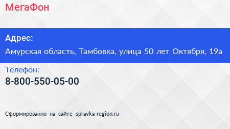 МегаФон по адресу Амурская область, Тамбовка, улица 50 лет Октября, 19а в дальнейшем Организация, размещена в следующих категориях: