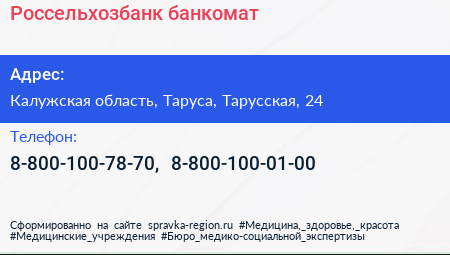 Россельхозбанк, банкомат по адресу Калужская область, Таруса, Тарусская, 24 в дальнейшем Организация, размещена в следующих категориях:
