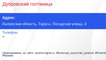 Дубровский, гостиница по адресу Калужская область, Таруса, Посадская улица, 2 в дальнейшем Организация, размещена в следующих категориях:
