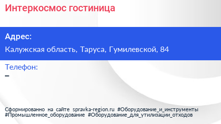 Интеркосмос, гостиница по адресу Калужская область, Таруса, Гумилевской, 84 в дальнейшем Организация, размещена в следующих категориях: