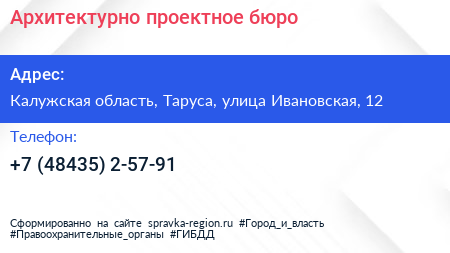 Архитектурно-проектное бюро по адресу Калужская область, Таруса, улица Ивановская, 12 в дальнейшем Организация, размещена в следующих категориях: