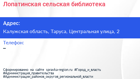 Лопатинская сельская библиотека по адресу Калужская область, Таруса, Центральная улица, 2 в дальнейшем Организация, размещена в следующих категориях: