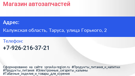 Магазин автозапчастей по адресу Калужская область, Таруса, улица Горького, 2 в дальнейшем Организация, размещена в следующих категориях:
