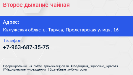 Второе дыхание, чайная по адресу Калужская область, Таруса, Пролетарская улица, 16 в дальнейшем Организация, размещена в следующих категориях: