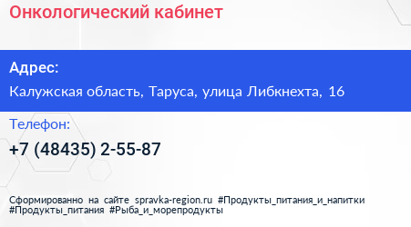 Онкологический кабинет по адресу Калужская область, Таруса, улица Либкнехта, 16 в дальнейшем Организация, размещена в следующих категориях: