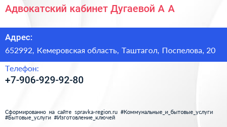 Адвокатский кабинет Дугаевой А.А. по адресу 652992, Кемеровская область, Таштагол, Поспелова, 20 в дальнейшем Организация, размещена в следующих категориях: