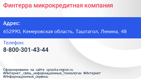 Финтерра, микрокредитная компания по адресу 652990, Кемеровская область, Таштагол, Ленина, 48 в дальнейшем Организация, размещена в следующих категориях: