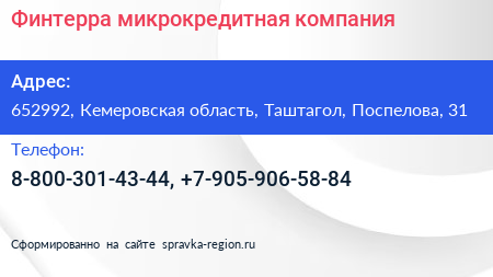 Финтерра, микрокредитная компания по адресу 652992, Кемеровская область, Таштагол, Поспелова, 31 в дальнейшем Организация, размещена в следующих категориях:
