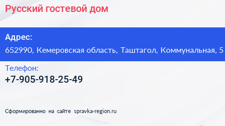 Русский, гостевой дом по адресу 652990, Кемеровская область, Таштагол, Коммунальная, 5 в дальнейшем Организация, размещена в следующих категориях: