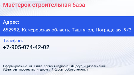 Мастерок, строительная база по адресу 652992, Кемеровская область, Таштагол, Ноградская, 9/3 в дальнейшем Организация, размещена в следующих категориях: