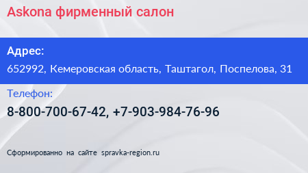 Askona, фирменный салон по адресу 652992, Кемеровская область, Таштагол, Поспелова, 31 в дальнейшем Организация, размещена в следующих категориях:
