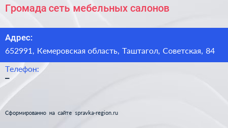 Громада, сеть мебельных салонов по адресу 652991, Кемеровская область, Таштагол, Советская, 84 в дальнейшем Организация, размещена в следующих категориях: