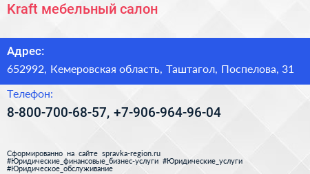 Kraft, мебельный салон по адресу 652992, Кемеровская область, Таштагол, Поспелова, 31 в дальнейшем Организация, размещена в следующих категориях: