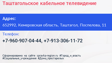 Таштагольское кабельное телевидение по адресу 652992, Кемеровская область, Таштагол, Поспелова, 11 в дальнейшем Организация, размещена в следующих категориях: