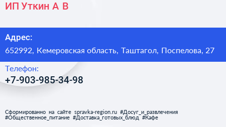 ИП Уткин А.В. по адресу 652992, Кемеровская область, Таштагол, Поспелова, 27 в дальнейшем Организация, размещена в следующих категориях:
