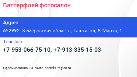Баттерфляй, фотосалон по адресу 652992, Кемеровская область, Таштагол, 8 Марта, 1 в дальнейшем Организация, размещена в следующих категориях: