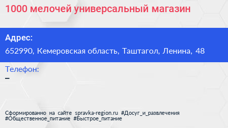 1000 мелочей, универсальный магазин по адресу 652990, Кемеровская область, Таштагол, Ленина, 48 в дальнейшем Организация, размещена в следующих категориях: