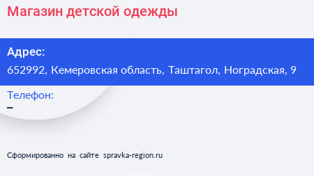 Магазин детской одежды по адресу 652992, Кемеровская область, Таштагол, Ноградская, 9 в дальнейшем Организация, размещена в следующих категориях: