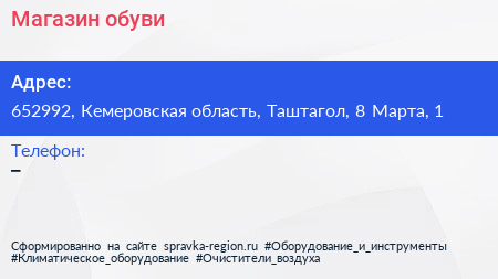 Магазин обуви по адресу 652992, Кемеровская область, Таштагол, 8 Марта, 1 в дальнейшем Организация, размещена в следующих категориях: