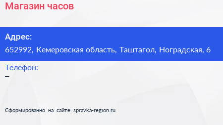 Магазин часов по адресу 652992, Кемеровская область, Таштагол, Ноградская, 6 в дальнейшем Организация, размещена в следующих категориях: