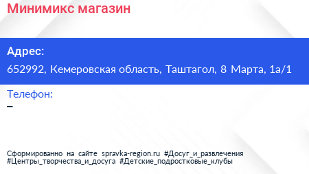 Минимикс, магазин по адресу 652992, Кемеровская область, Таштагол, 8 Марта, 1а/1 в дальнейшем Организация, размещена в следующих категориях: