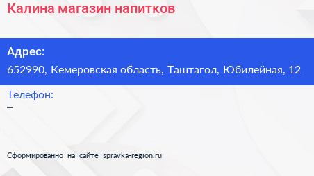 Калина, магазин напитков по адресу 652990, Кемеровская область, Таштагол, Юбилейная, 12 в дальнейшем Организация, размещена в следующих категориях: