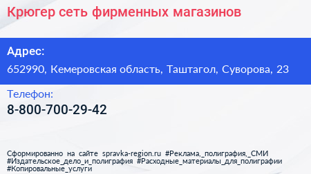 Крюгер, сеть фирменных магазинов по адресу 652990, Кемеровская область, Таштагол, Суворова, 23 в дальнейшем Организация, размещена в следующих категориях: