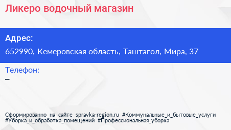 Ликеро-водочный магазин по адресу 652990, Кемеровская область, Таштагол, Мира, 37 в дальнейшем Организация, размещена в следующих категориях: