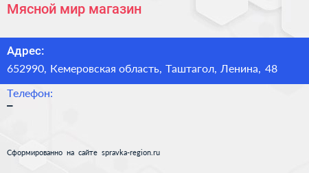 Мясной мир, магазин по адресу 652990, Кемеровская область, Таштагол, Ленина, 48 в дальнейшем Организация, размещена в следующих категориях: