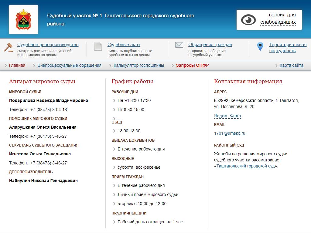 Мировые судьи Таштагольского городского судебного района по адресу 652992, Кемеровская область, Таштагол, Поспелова, 20 в дальнейшем Организация, размещена в следующих категориях: