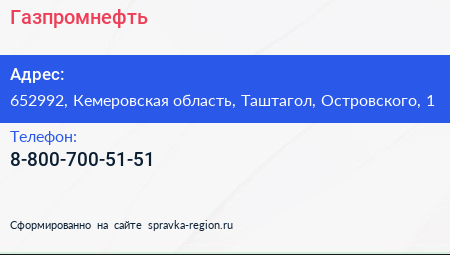 Газпромнефть по адресу 652992, Кемеровская область, Таштагол, Островского, 1 в дальнейшем Организация, размещена в следующих категориях:
