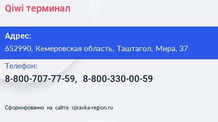 Qiwi, терминал по адресу 652990, Кемеровская область, Таштагол, Мира, 37 в дальнейшем Организация, размещена в следующих категориях: