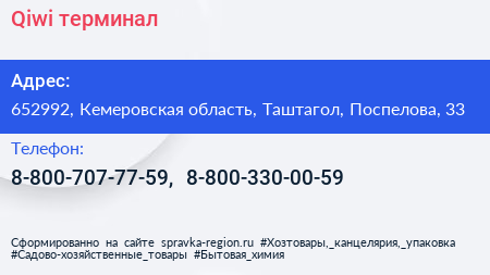 Qiwi, терминал по адресу 652992, Кемеровская область, Таштагол, Поспелова, 33 в дальнейшем Организация, размещена в следующих категориях: