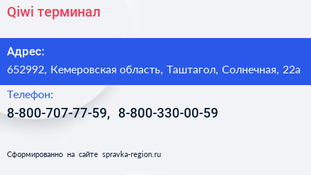 Qiwi, терминал по адресу 652992, Кемеровская область, Таштагол, Солнечная, 22а в дальнейшем Организация, размещена в следующих категориях: