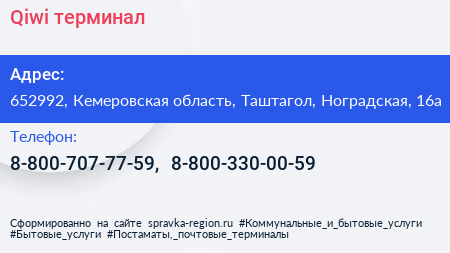 Qiwi, терминал по адресу 652992, Кемеровская область, Таштагол, Ноградская, 16а в дальнейшем Организация, размещена в следующих категориях: