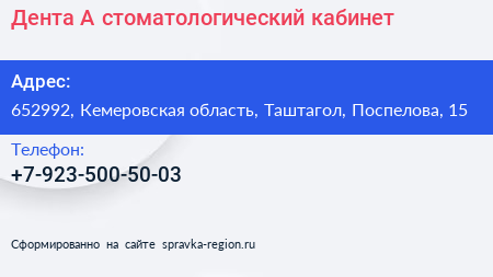 Дента-А, стоматологический кабинет по адресу 652992, Кемеровская область, Таштагол, Поспелова, 15 в дальнейшем Организация, размещена в следующих категориях:
