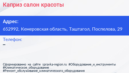 Каприз, салон красоты по адресу 652992, Кемеровская область, Таштагол, Поспелова, 29 в дальнейшем Организация, размещена в следующих категориях: