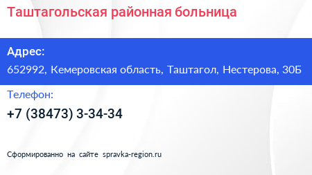Таштагольская районная больница по адресу 652992, Кемеровская область, Таштагол, Нестерова, 30Б в дальнейшем Организация, размещена в следующих категориях: