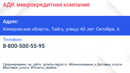 АДК, микрокредитная компания по адресу Кемеровская область, Тайга, улица 40 лет Октября, 6 в дальнейшем Организация, размещена в следующих категориях: