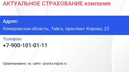 АКТУАЛЬНОЕ СТРАХОВАНИЕ, компания по адресу Кемеровская область, Тайга, проспект Кирова, 25 в дальнейшем Организация, размещена в следующих категориях: