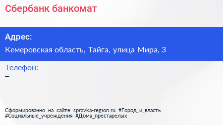 Сбербанк, банкомат по адресу Кемеровская область, Тайга, улица Мира, 3 в дальнейшем Организация, размещена в следующих категориях: