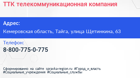 ТТК, телекоммуникационная компания по адресу Кемеровская область, Тайга, улица Щетинкина, 63 в дальнейшем Организация, размещена в следующих категориях: