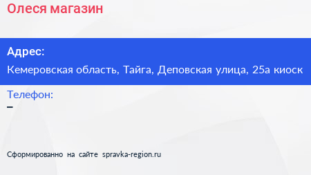 Олеся, магазин по адресу Кемеровская область, Тайга, Деповская улица, 25а киоск в дальнейшем Организация, размещена в следующих категориях: