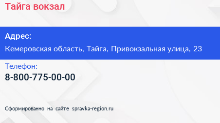 Тайга, вокзал по адресу Кемеровская область, Тайга, Привокзальная улица, 23 в дальнейшем Организация, размещена в следующих категориях: