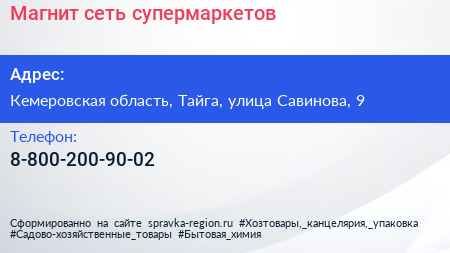 Магнит, сеть супермаркетов по адресу Кемеровская область, Тайга, улица Савинова, 9 в дальнейшем Организация, размещена в следующих категориях: